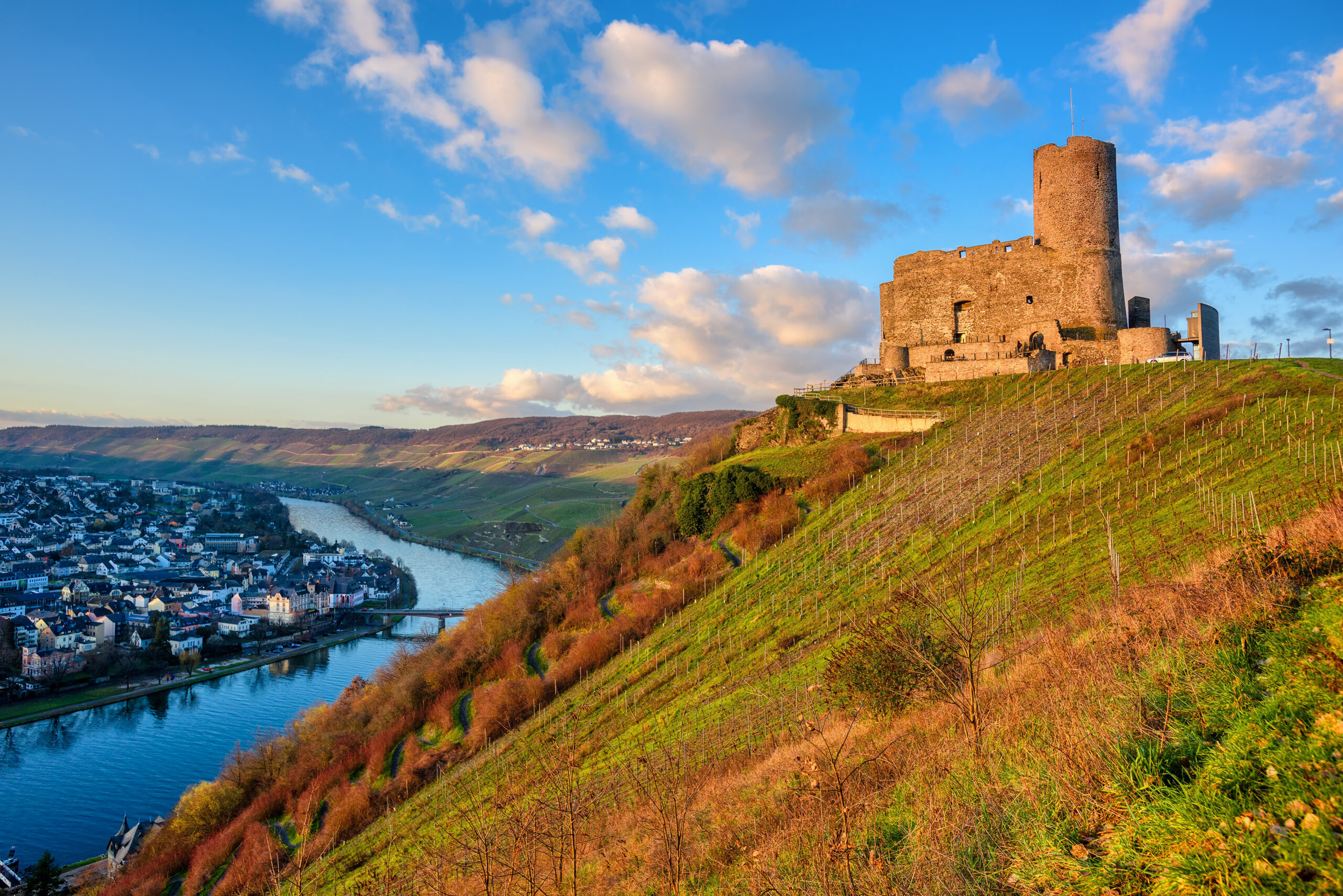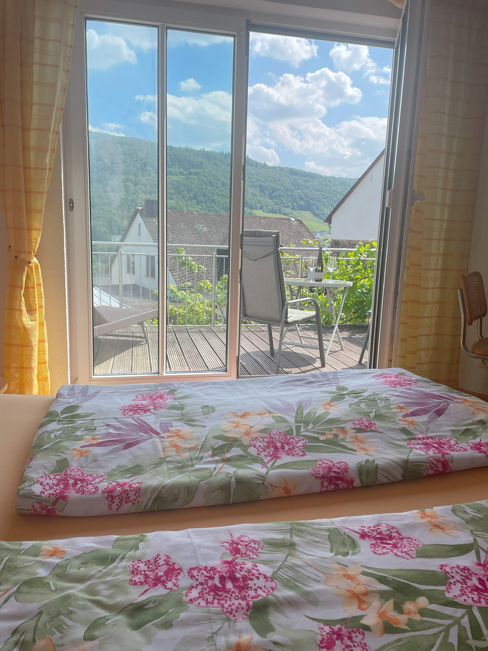 Angrenzend an den separaten Schlafraum ist eine große Aussichtsterasse mit Weitblick über das Moseltal.